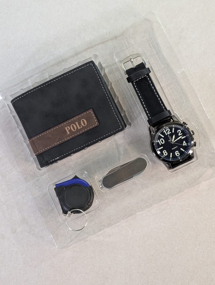 Elegancia y funcionalidad en un solo set. Este combo de reloj analógico y billetera de cuero genuino es el accesorio perfecto para el hombre moderno. Diseño sofisticado, materiales de calidad y máxima organización para tu día a día.