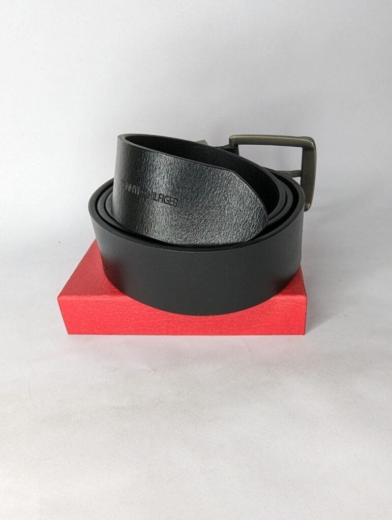 Faja Tommy Hilfiger para hombre en color negro, talla 36. Fabricada en cuero sintético con hebilla metálica color bronce y logo de la marca. Estilo clásico de vestir, ideal para complementar un look elegante.