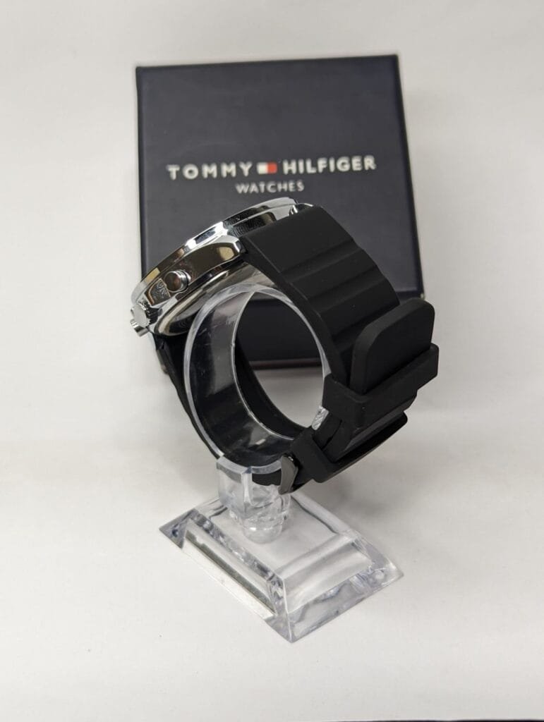 Reloj Tommy Hilfiger para hombre con correa de caucho negra y caja de acero inoxidable color negro. Este reloj analógico es resistente al agua y al polvo, con funcionalidades adicionales como ahorro de batería.