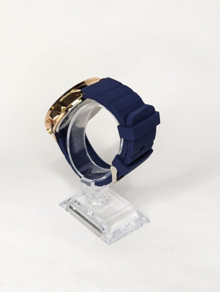 Reloj Tommy Hilfiger para hombre con correa de caucho azul oscuro. Caja de acero inoxidable con acabado dorado. Es un reloj analógico resistente al agua y al polvo, ideal para un estilo casual y activo.